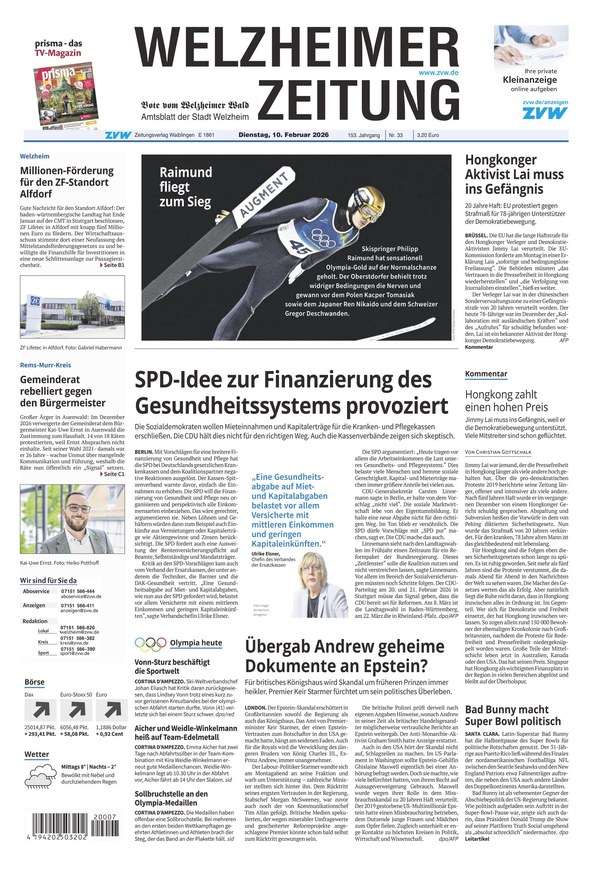 Die Welzheimer Zeitung liefert tagesaktuelle Nachrichten aus Welzheim und Umgebung. Zusätzlich berichtet die Tagezeitung über wichtige Geschehnisse aus aller Welt. Weiterlesen...