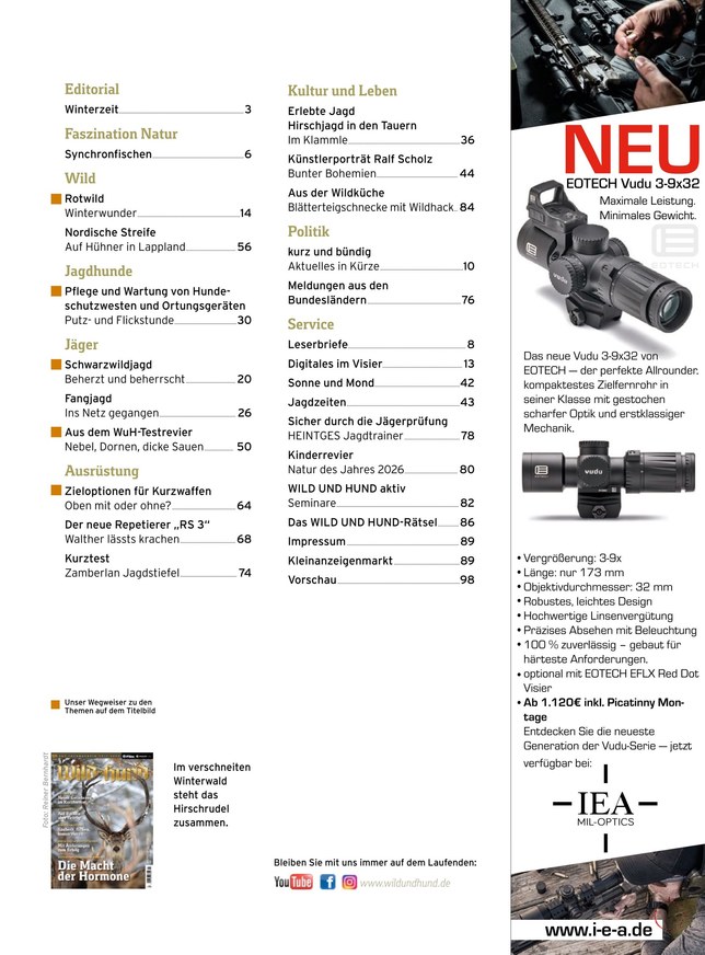 Wild und Hund berichtet über alle Themen rund um die Jagd: Wild, Revier, Ausrüstung, Jagdpraxis und vieles mehr. Bleiben Sie mit den ePaper der ältesten Jagdzeitschrift Deutschlands informiert! Weiterlesen...