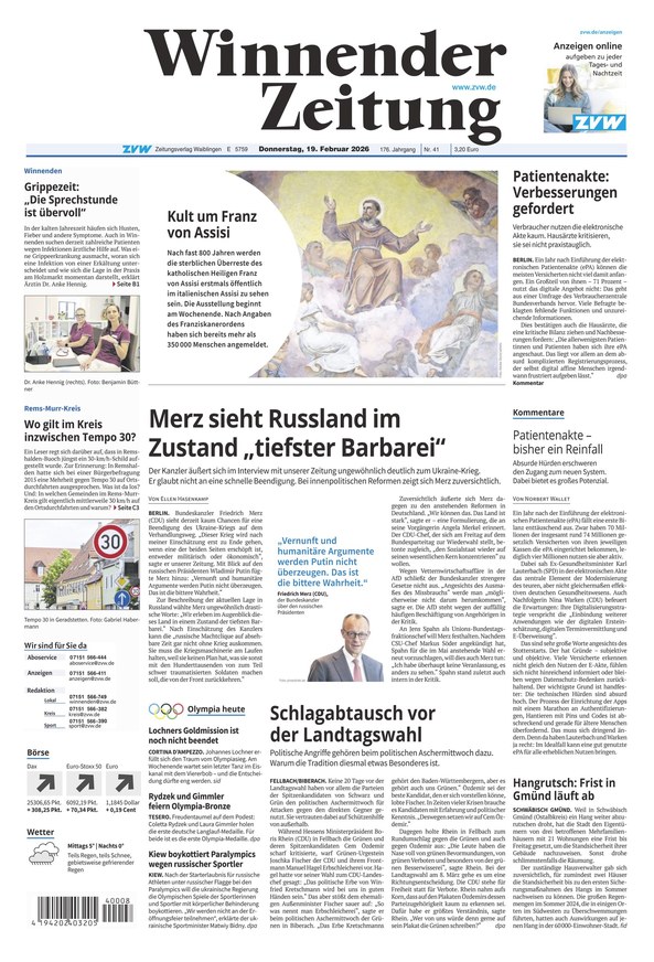 Die Winnender Zeitung berichtet über alle Themen im Rems-Murr-Kreises. Alle aktuellen Nachrichten aus Winnenden erfahren Sie in Ihrer lokalen Tageszeitung! Weiterlesen...