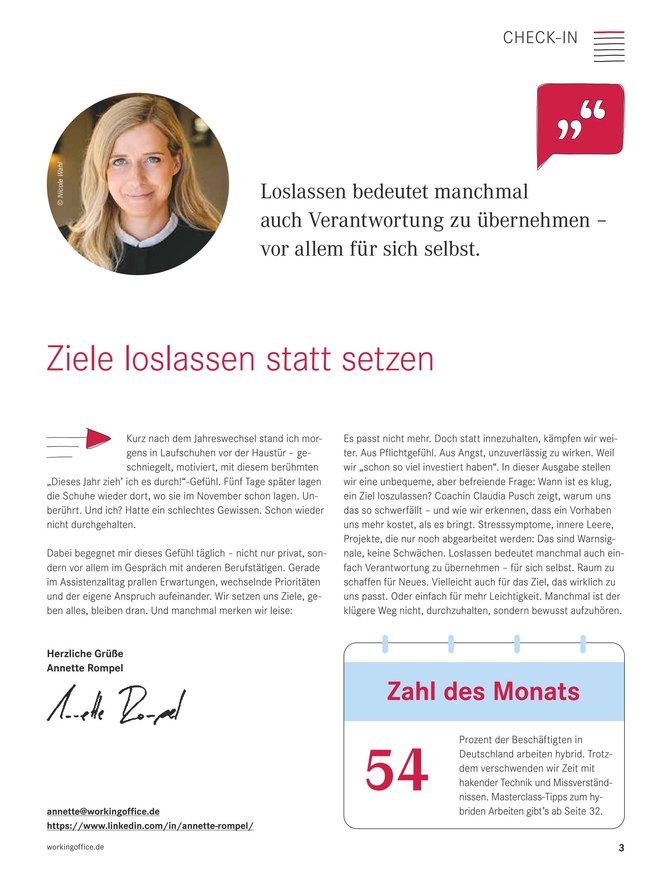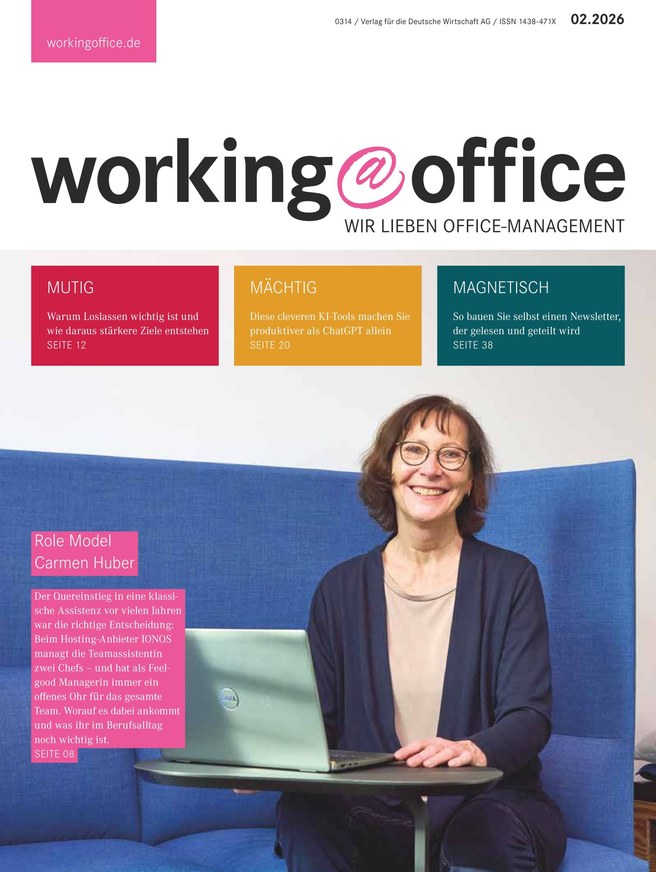 Working@office ist hauptsächlich für die Assistenz gedacht, hier finden sich Tipps zur Entlastung der Vorgesetzten, modernes Zeitmanagement und Koordination. Es geht außerdem um die eigene Weiterbildung, bessere Organisation und zukünftige Karriereplanungen. Diese Zeitschrift gibt monatlich nicht nur die neuesten News aus dem arbeitsrechtlichen Kontext, sondern auch die aktuellsten Entwicklungen für ein entspanntes Arbeiten. Mit nützlichen Tricks zur Steigerung der eigenen Geduld und Resilienz können Lesende einen optimalen Umgang mit der Arbeitswelt erschaffen. Mithilfe der Rubriken werden aktuelle Richtlinien, Kommunikationstipps, Büro- und Kollegenknigge und auch der Umgang mit Digitalisierung erklärt. Darüber hinaus gibt working@office einen hilfreichen Überblick, um sich als Individuum auf der Arbeit, aber auch danach zu finden und wohlzufühlen.