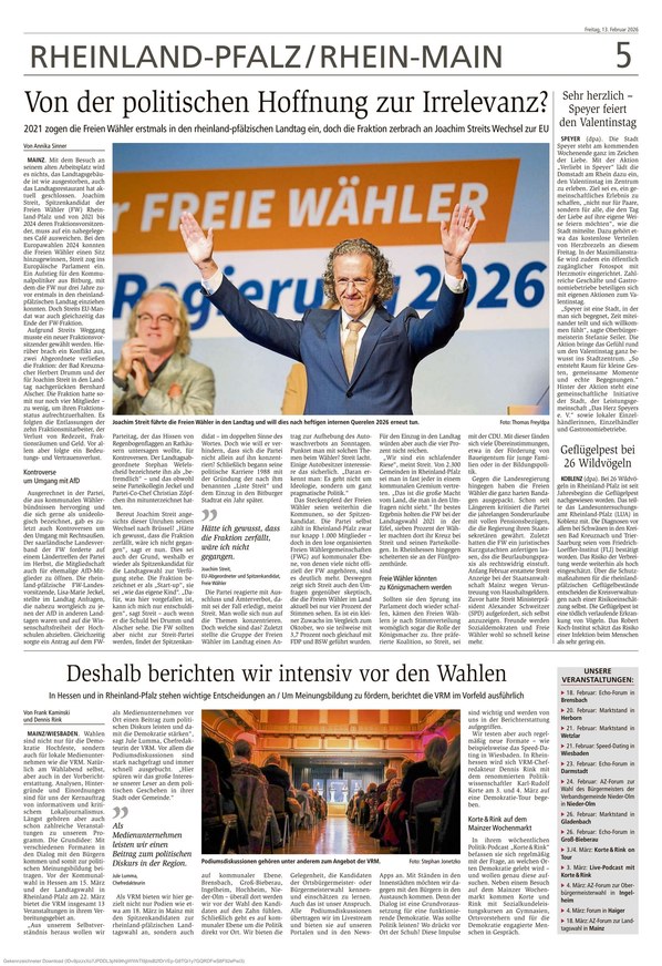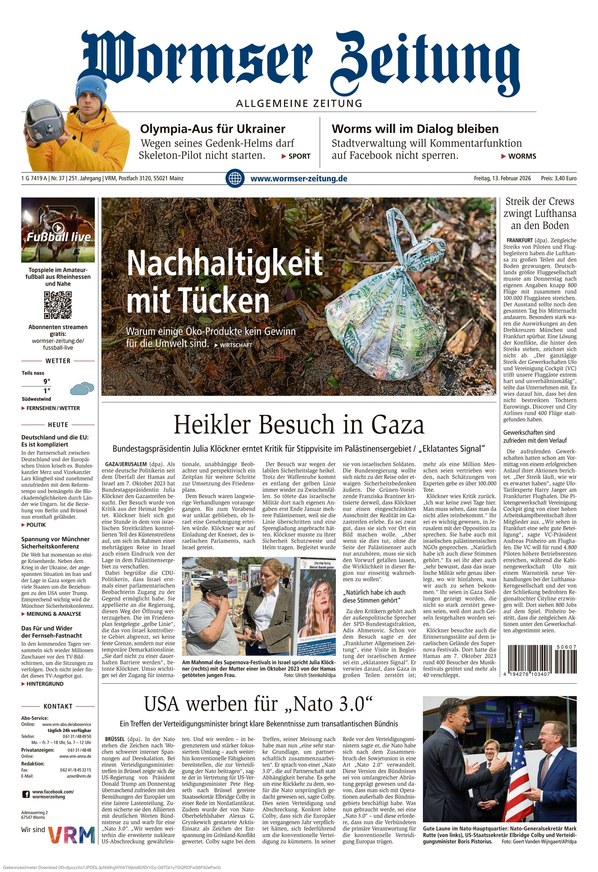 Die Wormser Zeitung ist Ihre traditionsreiche Informationsquelle, die mit umfassender Berichterstattung aus Worms und Rheinhessen alle Facetten von aktuellen lokalen Nachrichten über politische Entwicklungen und Wirtschaftsthemen bis hin zu Kultur, Sport und gesellschaftlichen Ereignissen abdeckt.