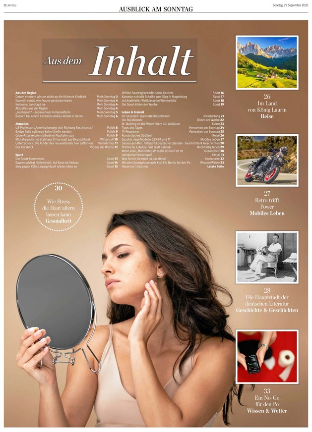 Das Ressort Leben & Freizeit beschäftigt sich unter anderem mit Themen aus den Bereichen Unterhaltung, Literatur, TV, Reise, Auto, Wohnen, Wissen und Wetter. Genießen Sie diese Sonntagslektüre am Bildschirm und profitieren Sie von zusätzlichen Funktionen wie Suche und Zoom sowie der Möglichkeit Lesezeichen zu setzen.